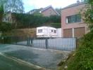 Portail coulissant sur rail incliné adapté la topographie de l'entrée. Sol incliné, pente montante vers la maison. Besoin d'une ouverture large pour manoeuvrer la caravanne. Le portail incliné coulisse derrière une grille fixe suivant la pente du sol. Largeru d'ouverture maximum!