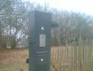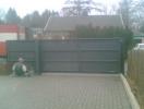 Portail tôlé "une face" avec panneaux pleins et perforés disposés en damier. Ici la solution du "coulissant autoportant" était privilégiée par le client qui ne souhaitait pas réouvriri une entrée en "klinkers" récemment aménagée. L'élément de boîte aux lettres ainsi que le poteau support du portail sont pourvus d'éclairages LEDs incorporés.